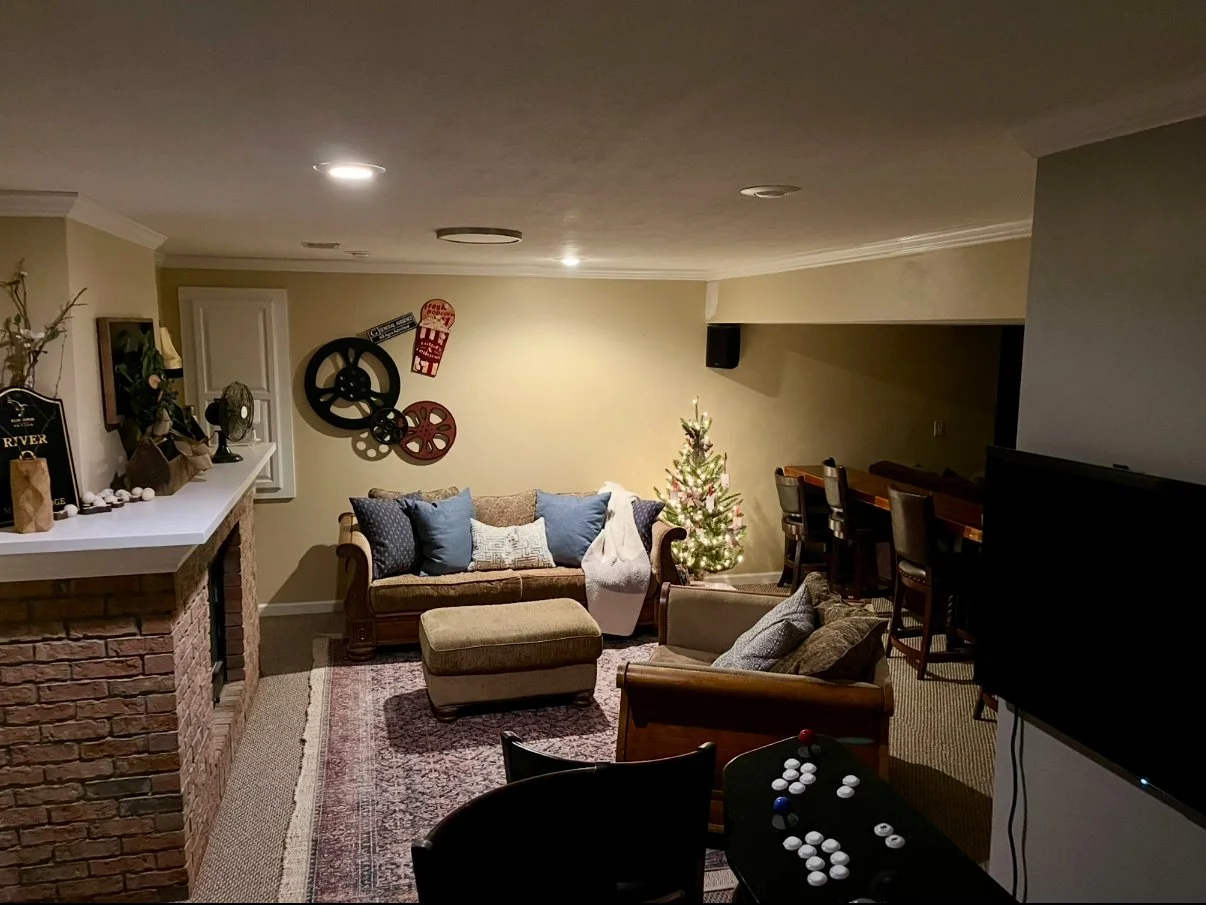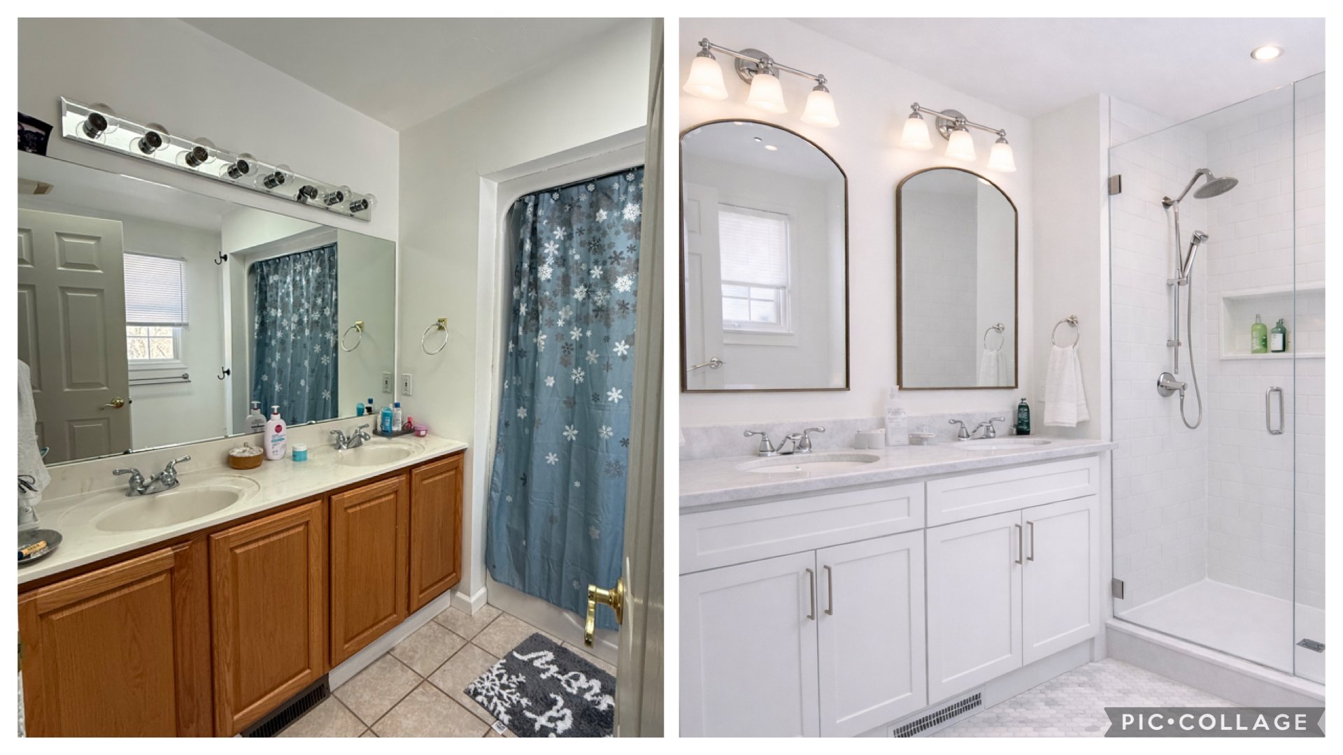 I was brought in to help design multiple areas of a full home remodel, including the basement, stairway, kitchen, first-floor half bath, primary bath, and kids’ bath.