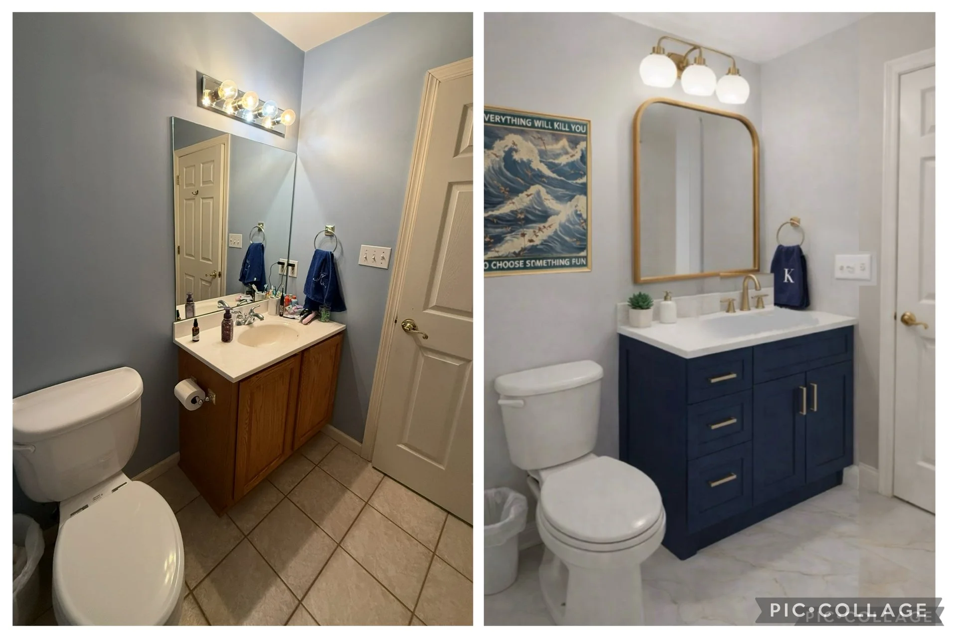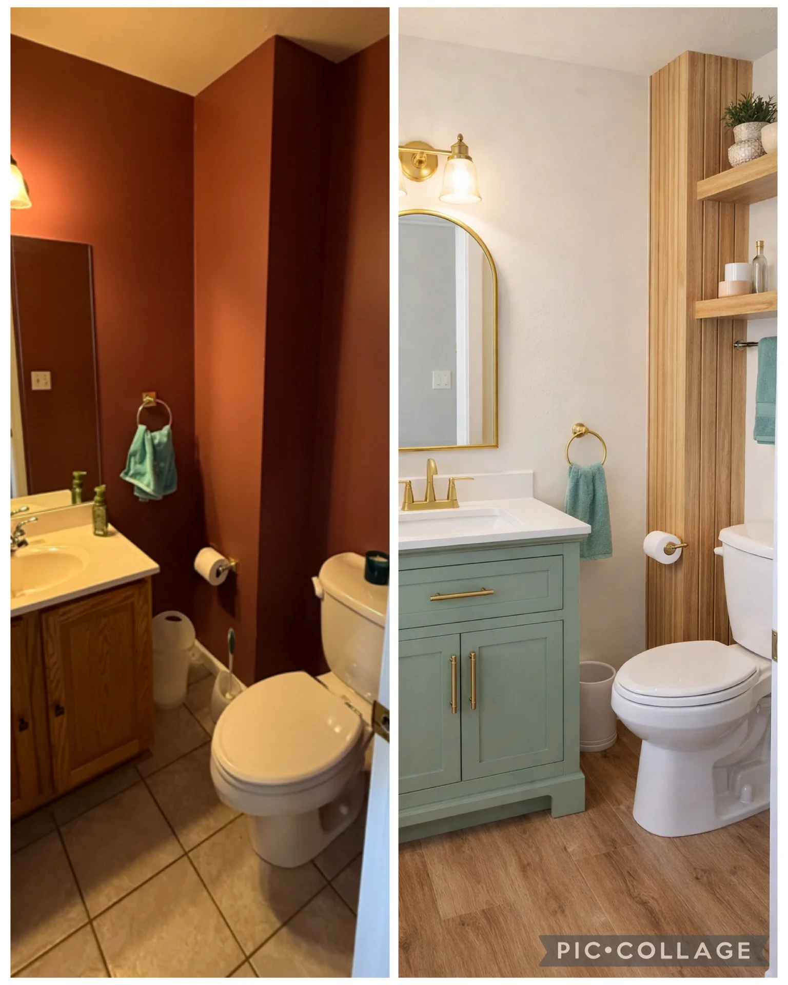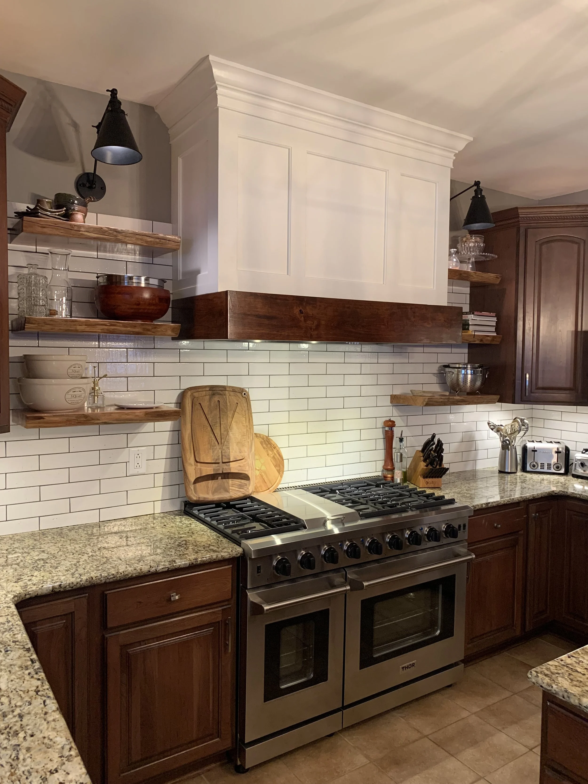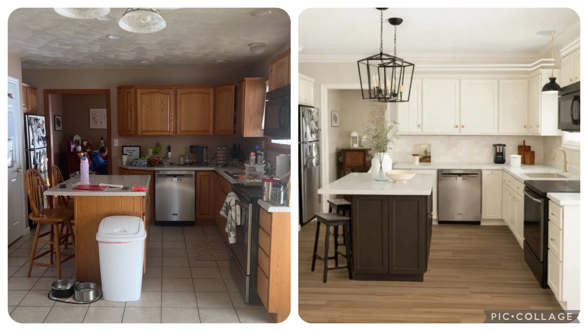 In addition, I introduced architectural enhancements — such as a bulkhead with crown molding and trim to extend the upper kitchen cabinets to the ceiling, and wood paneling to transform an awkward half-bath corner into an intentional design feature.